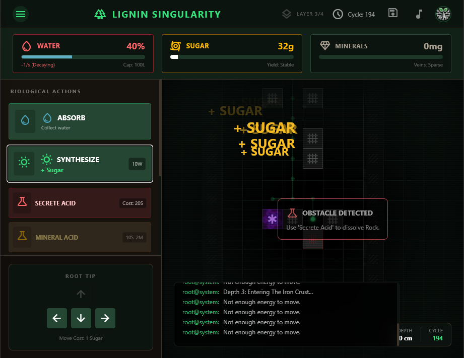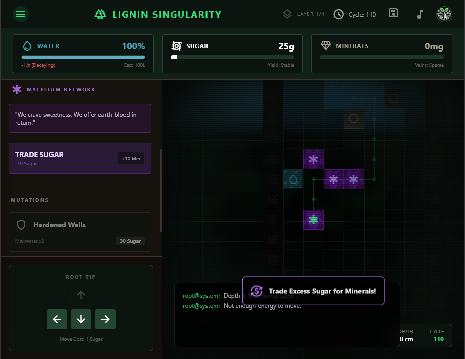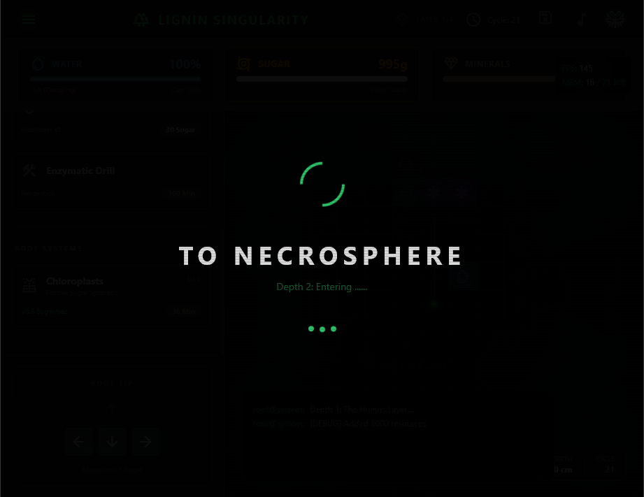 In this Phase 1 Prototype, you must guide a single taproot down through the geological history of a dead world. Manage your water levels against the constant threat of transpiration, trade chemicals with ancient fungal networks, and evolve your cellular structure to pierce bedrock.