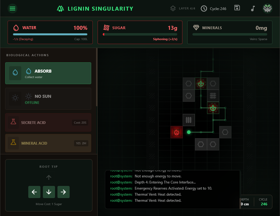 The Lignin Singularity is an unfolding incremental strategy game inspired by Universal Paperclips and the biological horror of deep time. You do not play as a gardener; you play as a biological imperative. Your directive is simple: Do not wither.